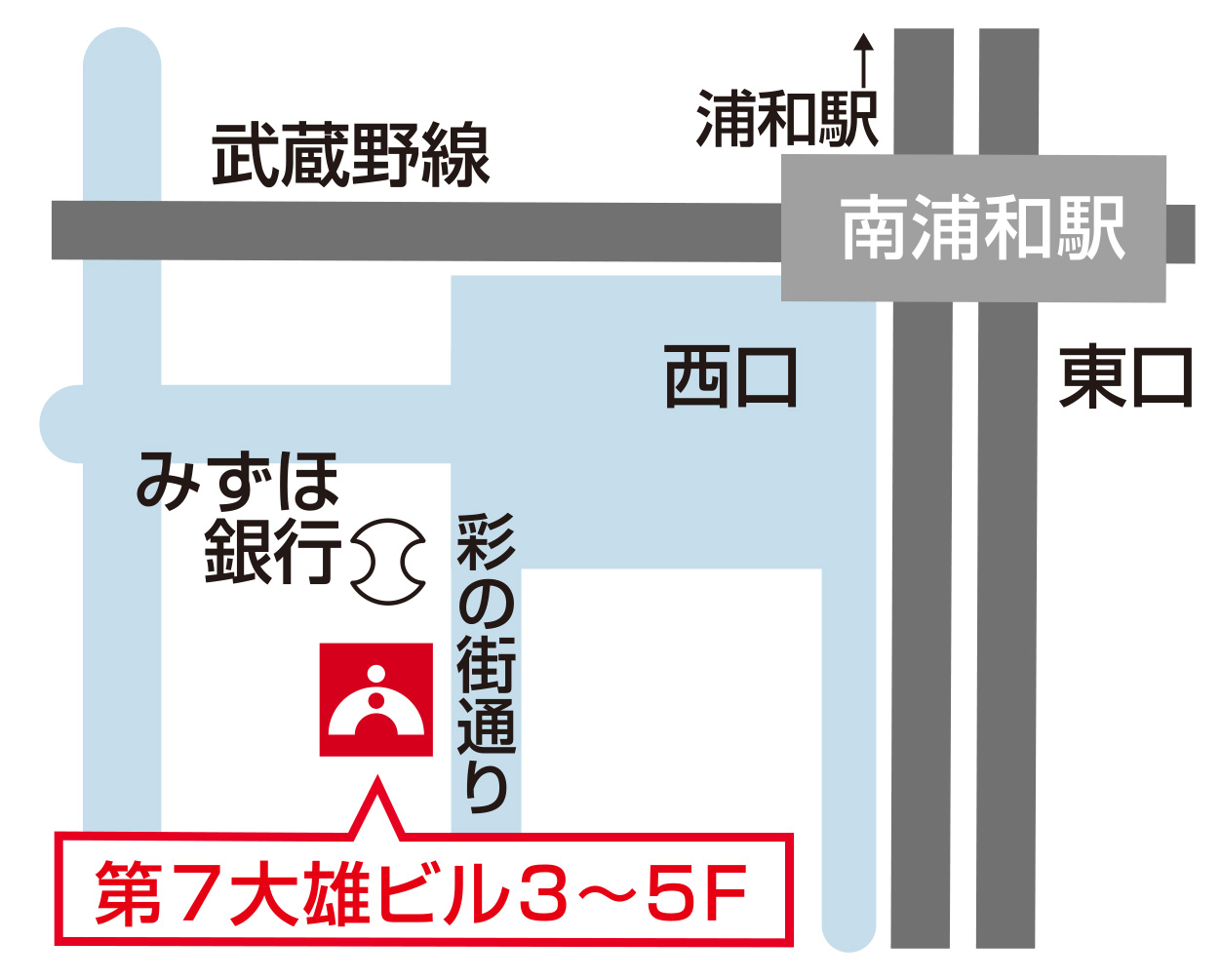 JR南浦和駅の西口を出て、正面のバスロータリーの左側の歩道を進み、みずほ銀行が見えたら、左折して彩の街通りに入ります。右手に見える第7大雄ビルの3-5FがTOMAS南浦和校です。