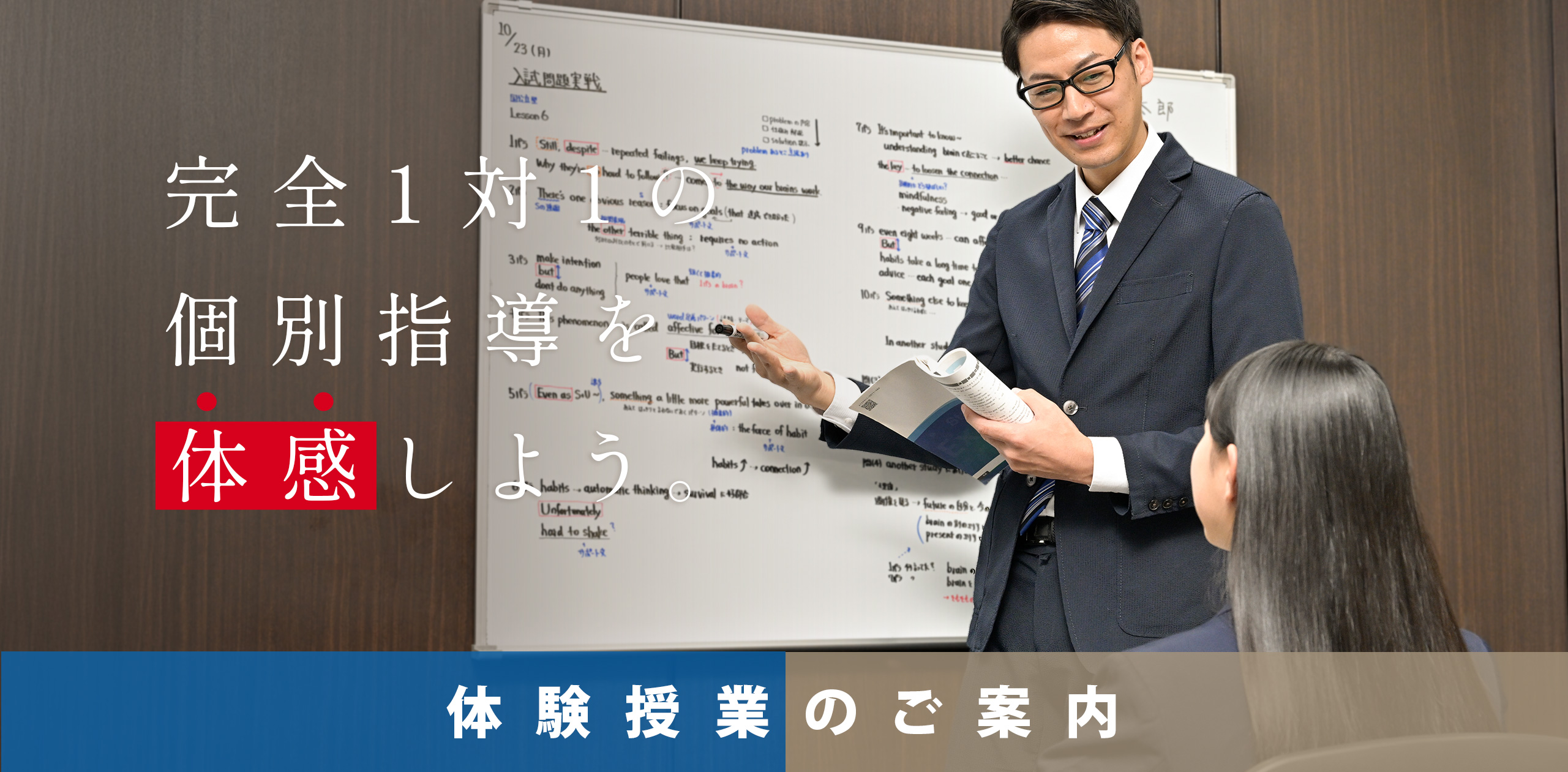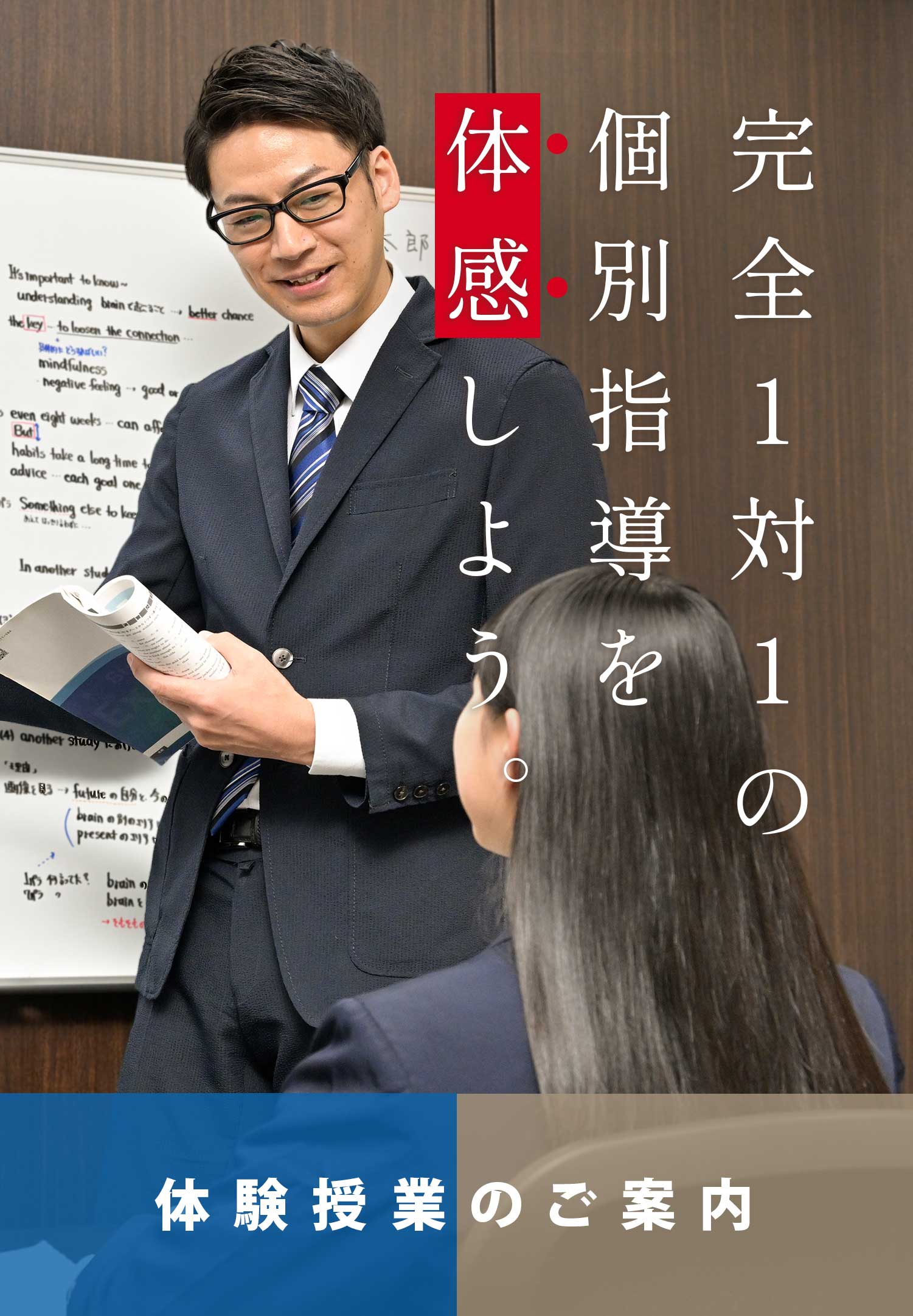 - ③ 当日は筆記用具・ノートをご持参のうえ、ご予約の校舎にお越しください。プロ講師が完全1対1授業を実施します。